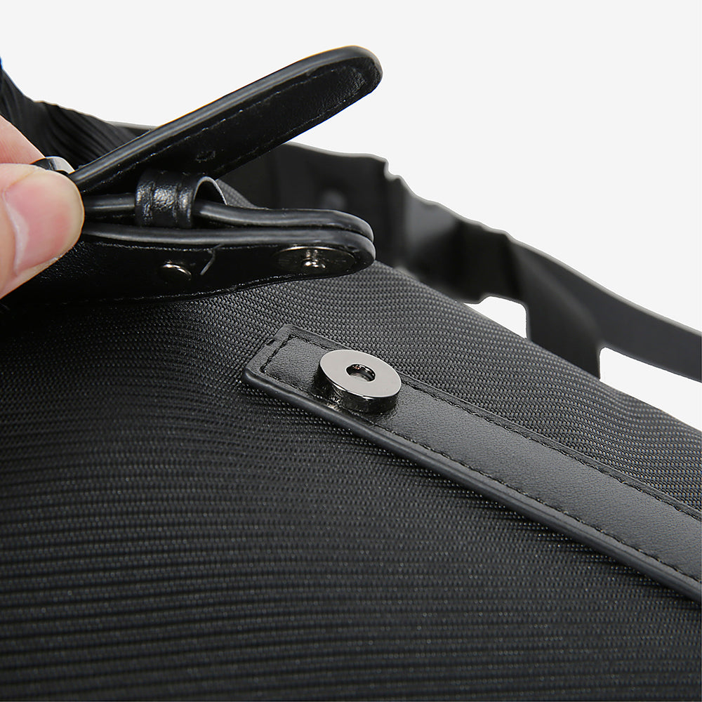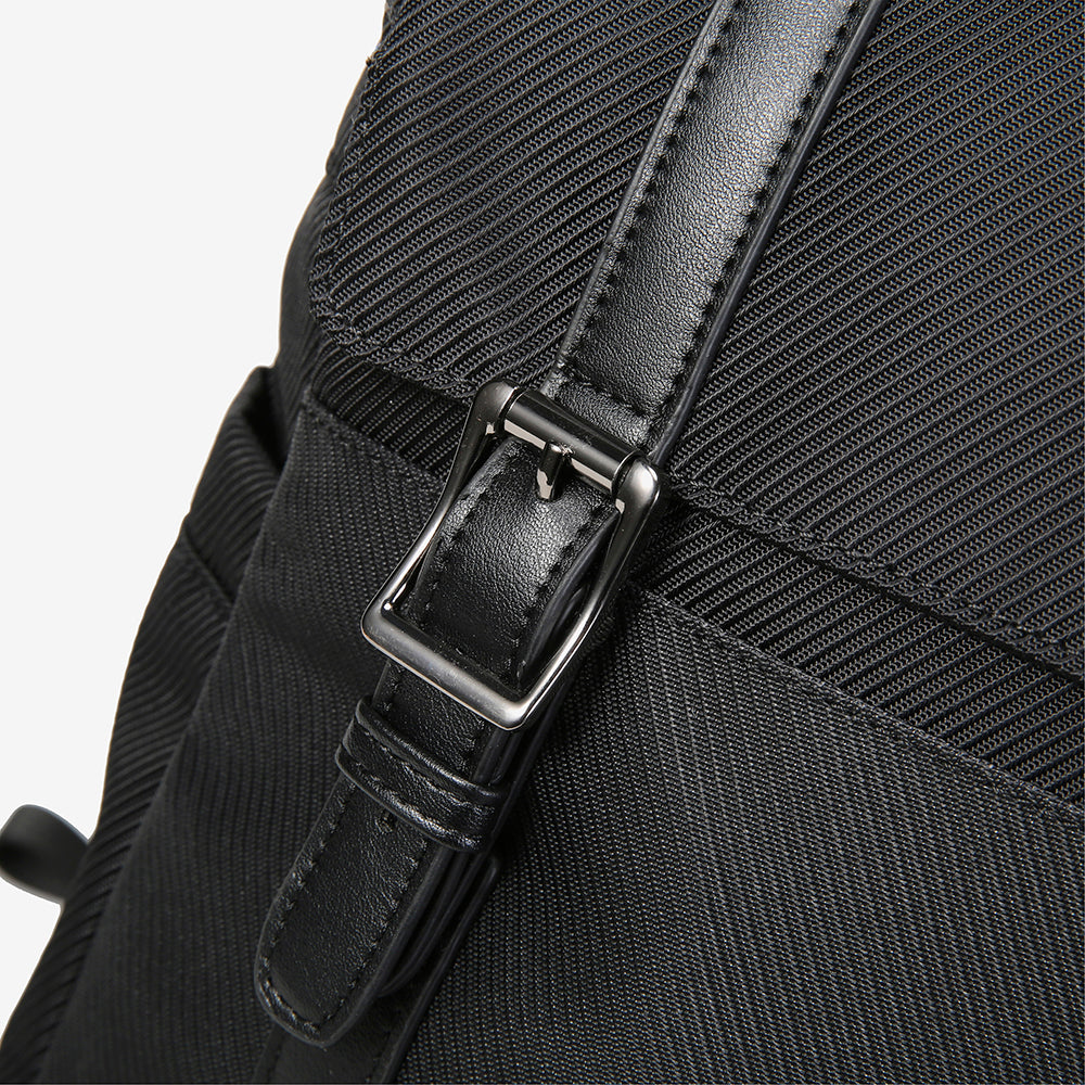 Close-up of a black bag with a strap and buckle on a white background