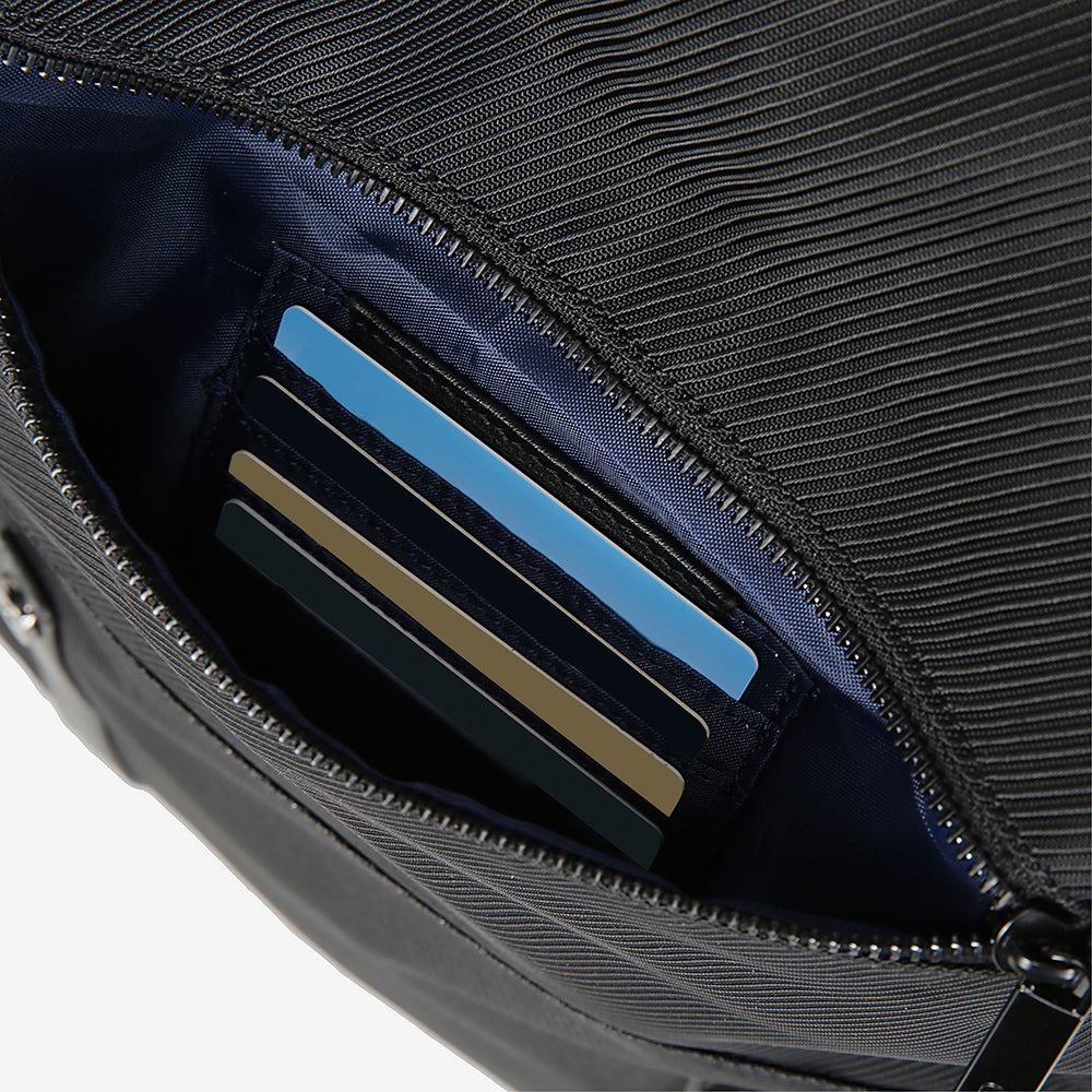 Close-up of a black textured bag with a card holder inside on a white background