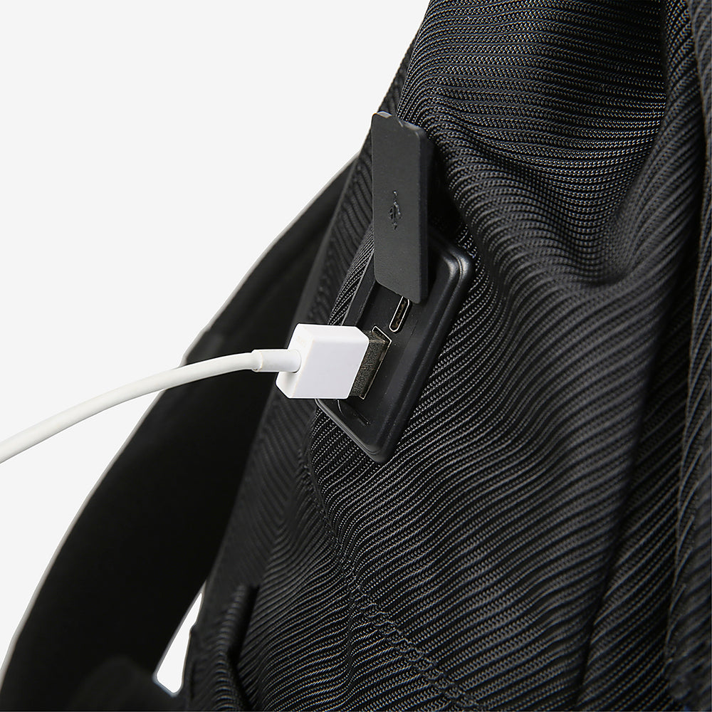Black backpack with a USB port and cable attached on a white background