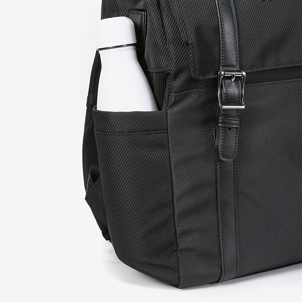 Black backpack with a white bottle inside a pocket on a light gray background