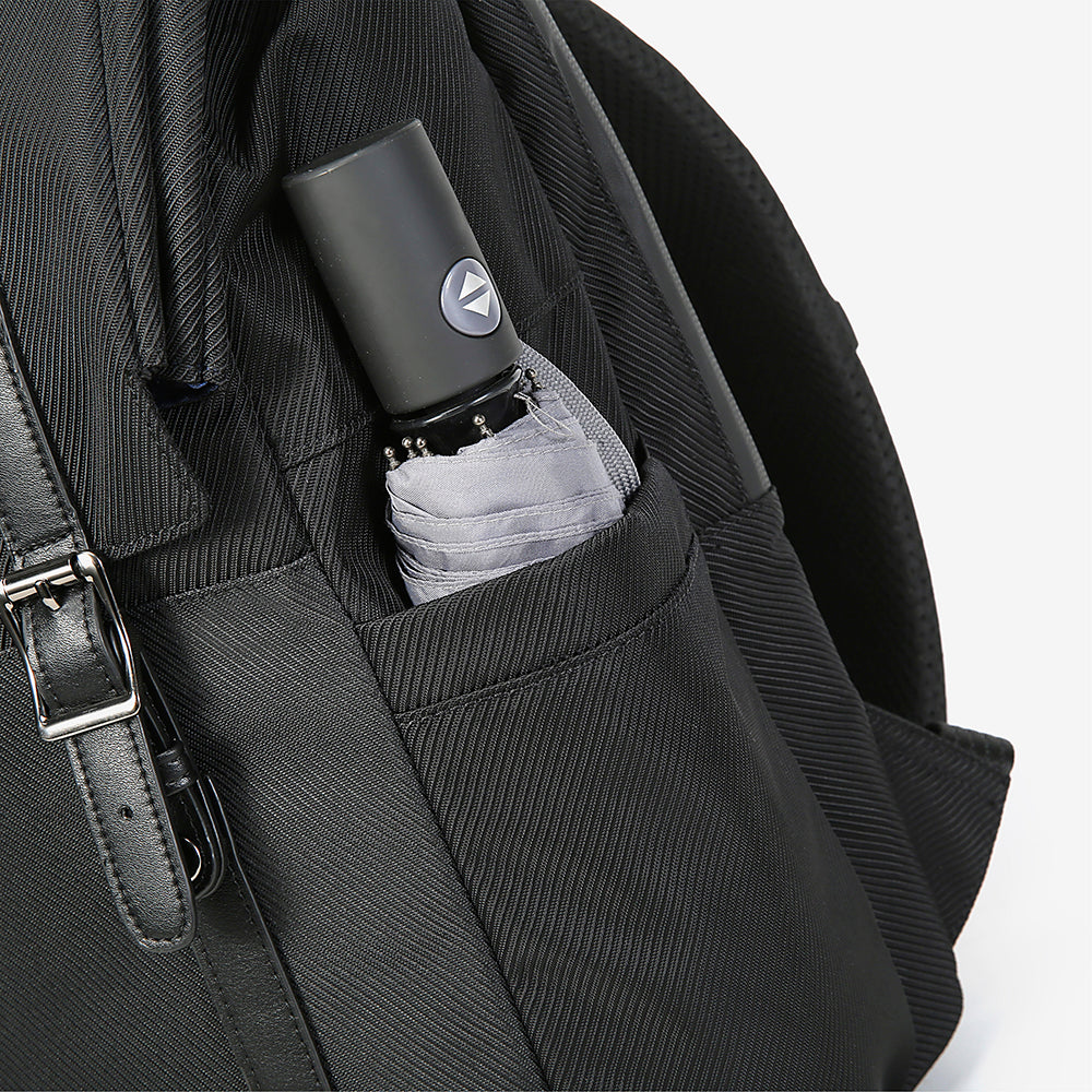 Black backpack with a folded umbrella inside, on a white background