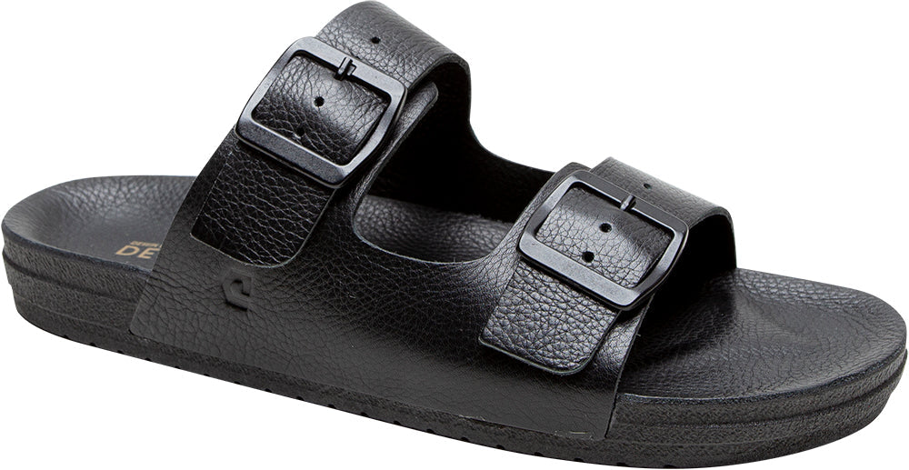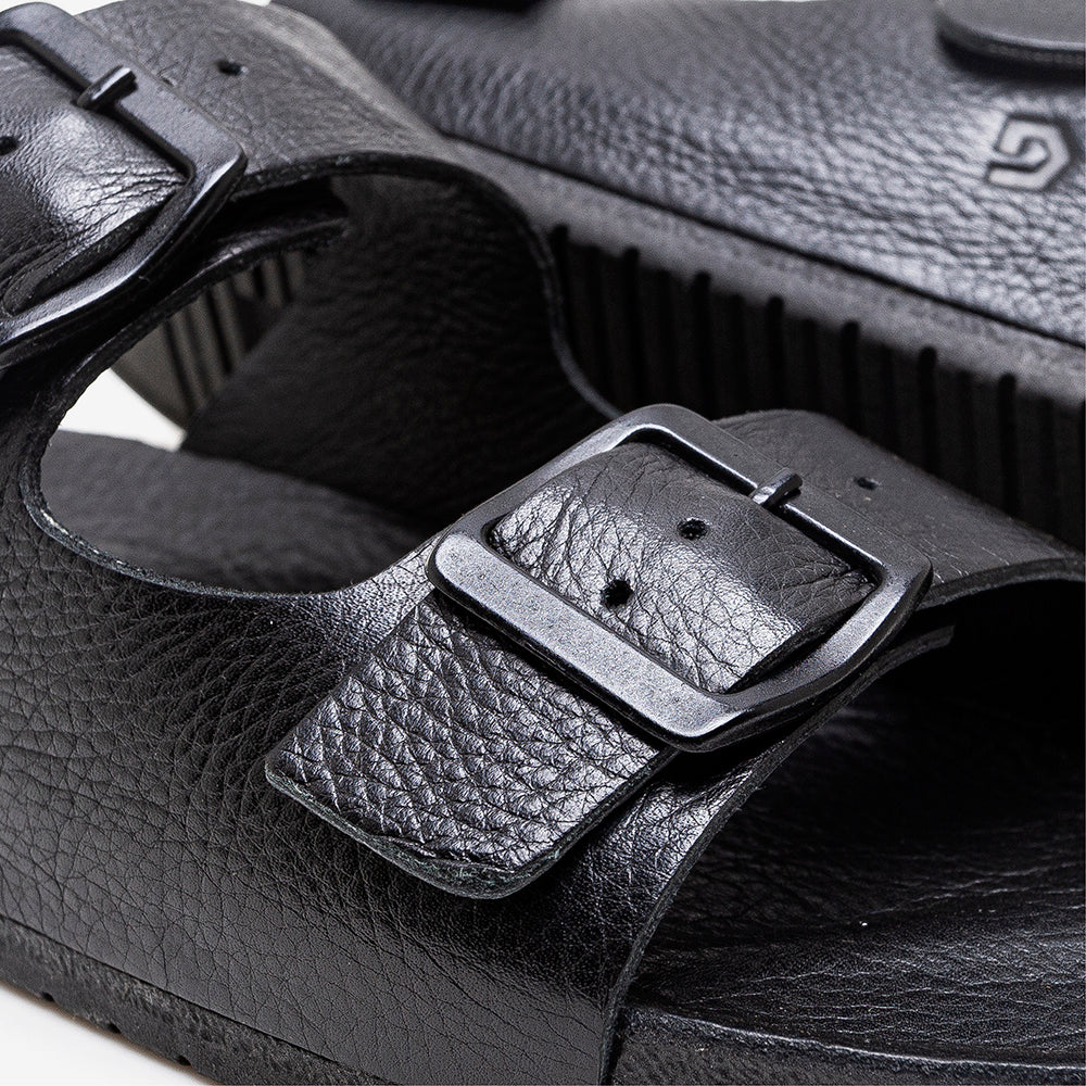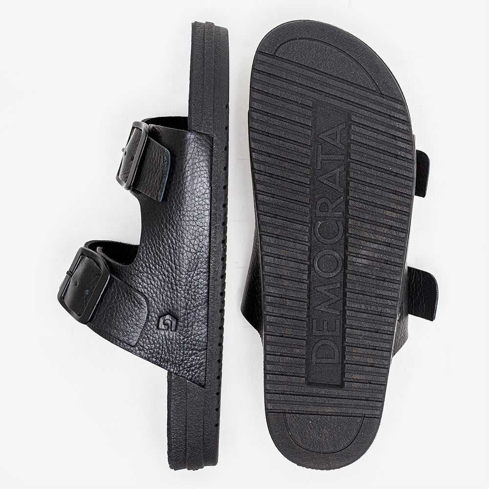 Black sandal with double buckle strap on a white background