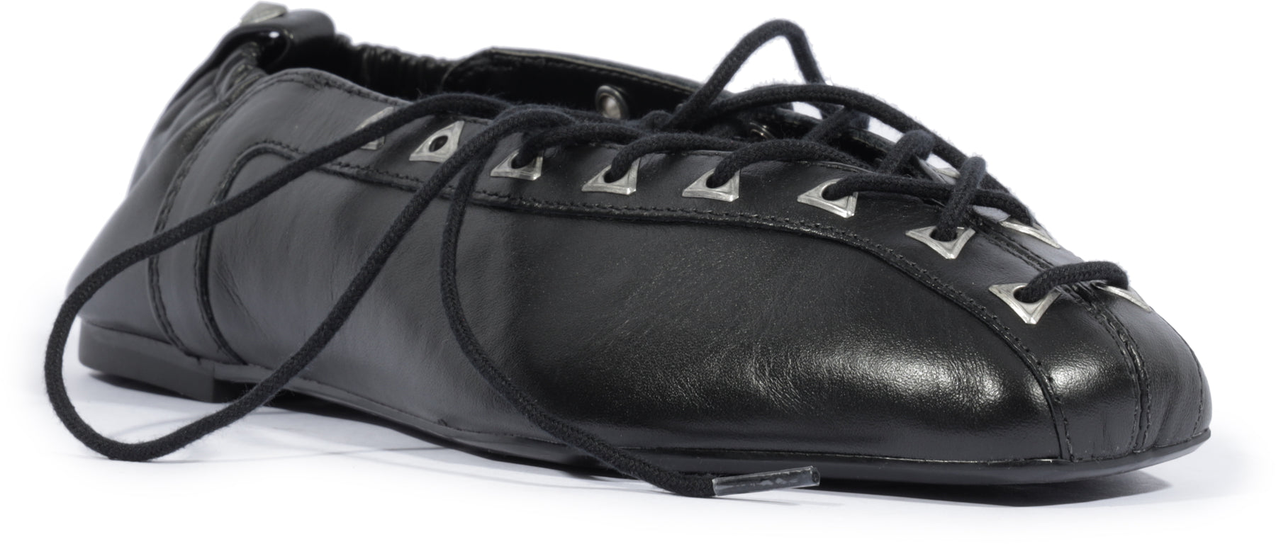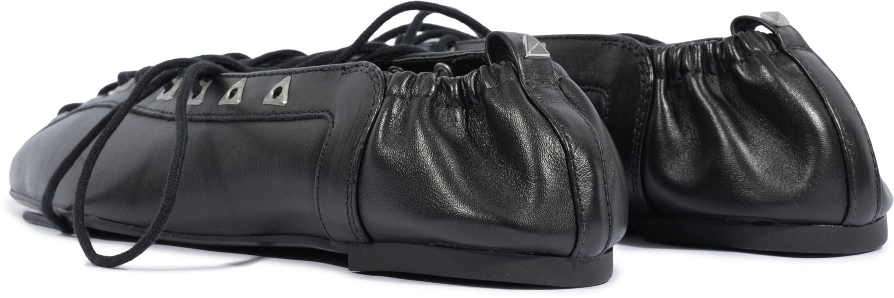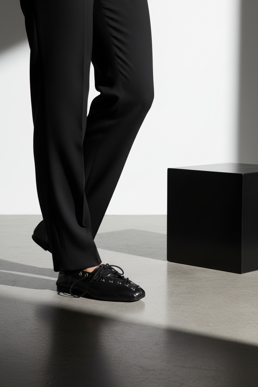 The inara flat channels ballet energy with a sharper, more street-ready approach. Made from sleek black leather and finished with lace-up detailing, it's both soft and structured, refined yet wearable. The curved vamp and low silhouette give it all-day versatility. Pair with cargo pants, wide-leg denim, or even layered socks and a slip dress for a versatile look, as it's the flat that turns heads—quietly but confidently.