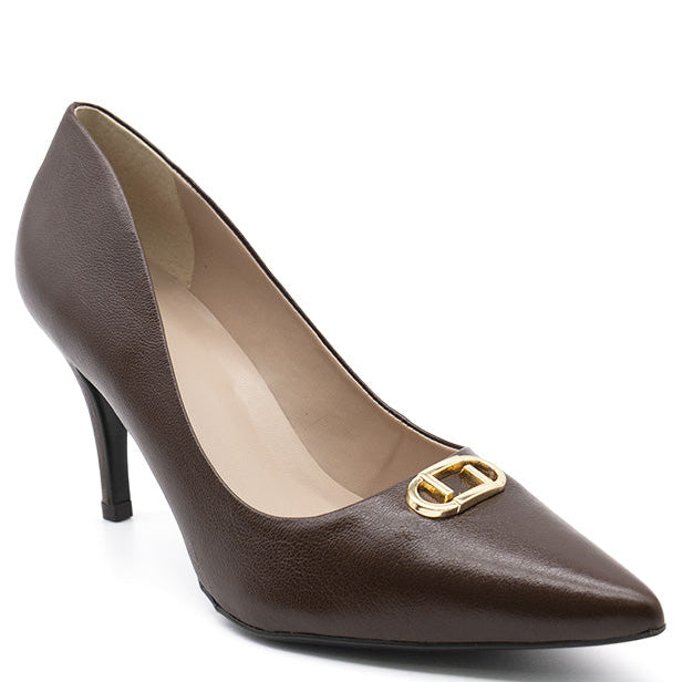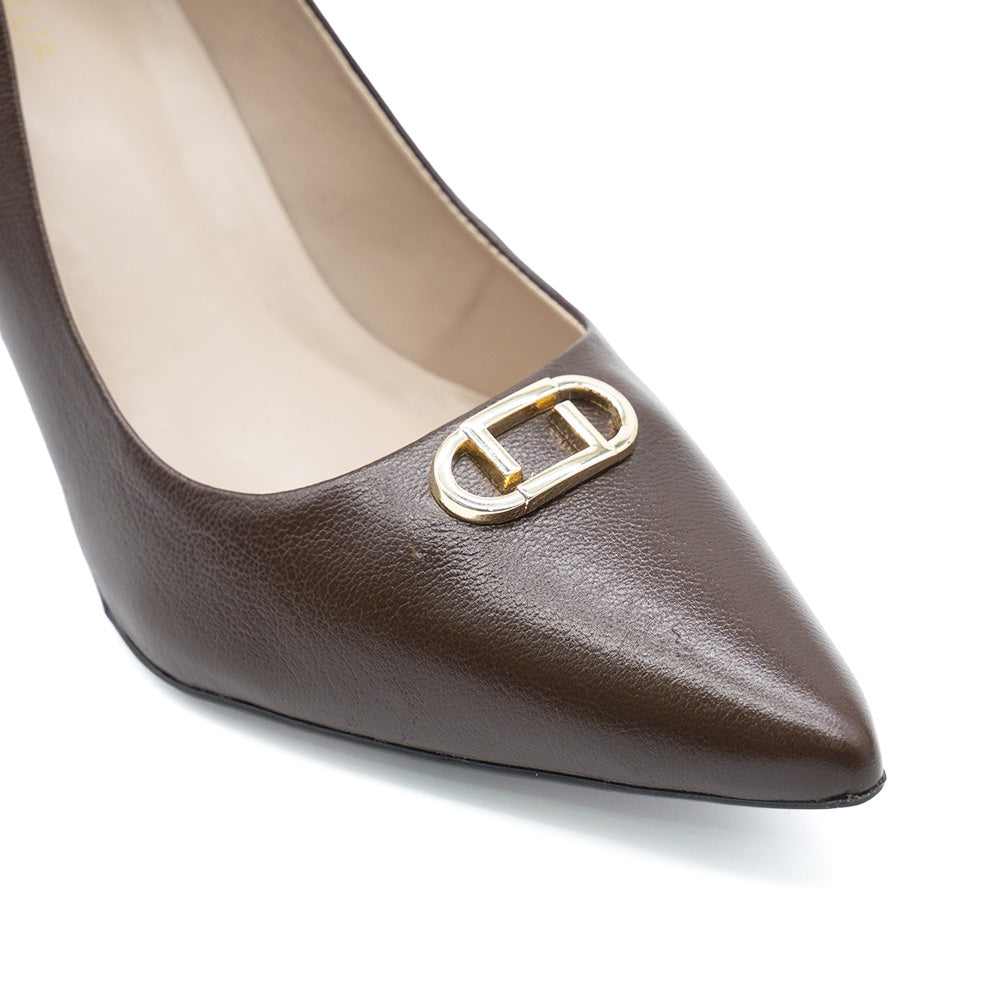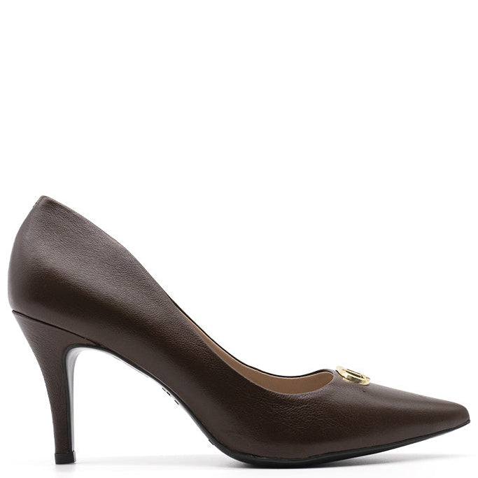 The Luz da Lua Fenela stiletto features premium leather craftsmanship combined with a sophisticated golden ornament, offering both elegance and durability. Its sleek silhouette enhances posture and complements formal or evening attire, making it an expert choice for refined style and confidence.