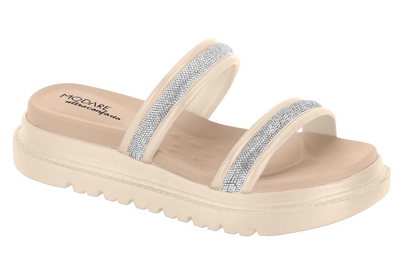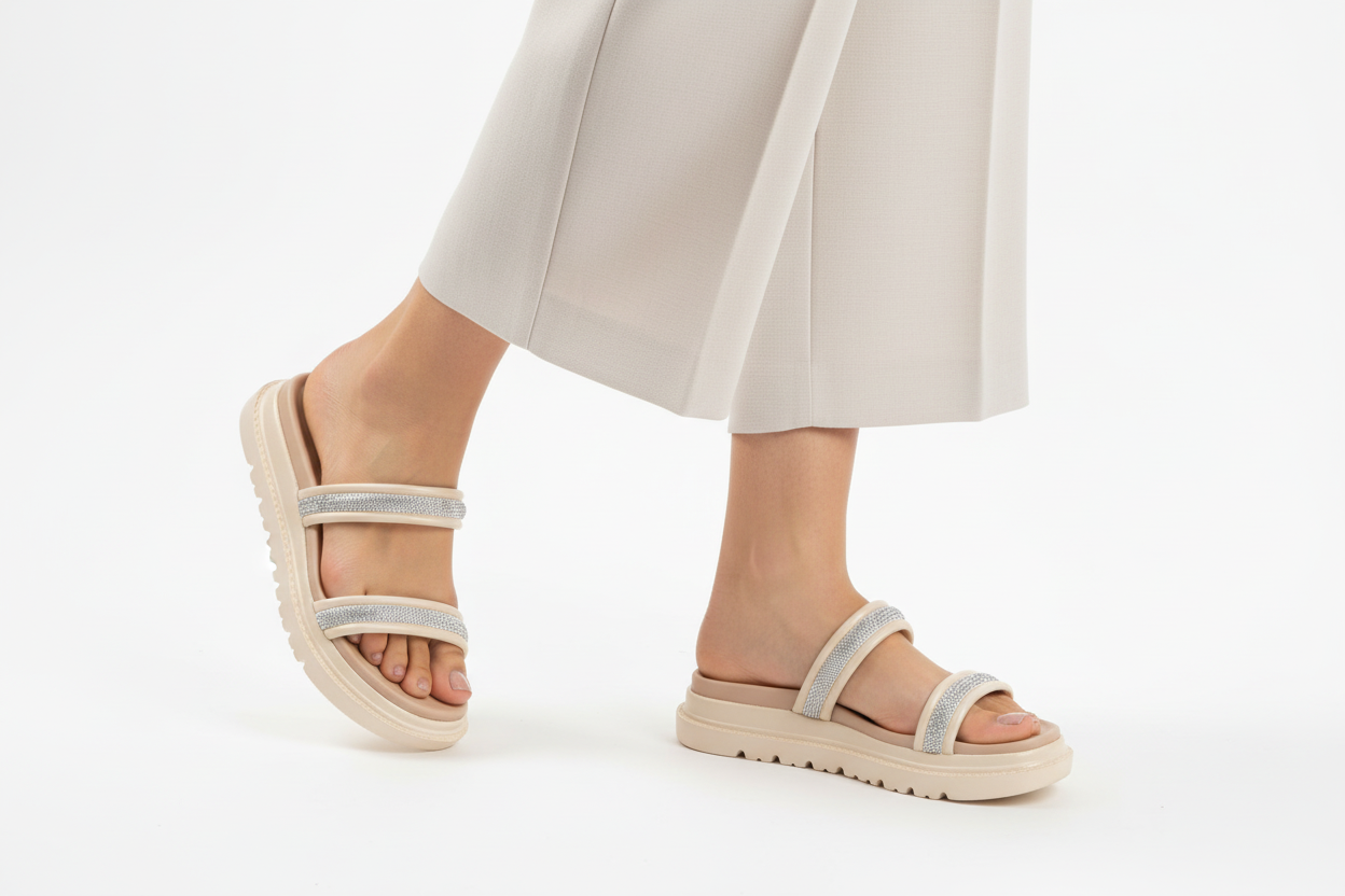 Sandalias flatform de Modare que combinan comodidad y estilo. Diseñadas con dos tiras brillantes que capturan la luz, ofrecen un acabado sofisticado y versátil. La plantilla acolchada proporciona soporte durante todo el día, mientras que la construcción brasileña garantiza calidad premium. Perfectas para elevar cualquier look casual o de transición, estas flatforms son la opción ideal para quien busca altura sin sacrificar confort.