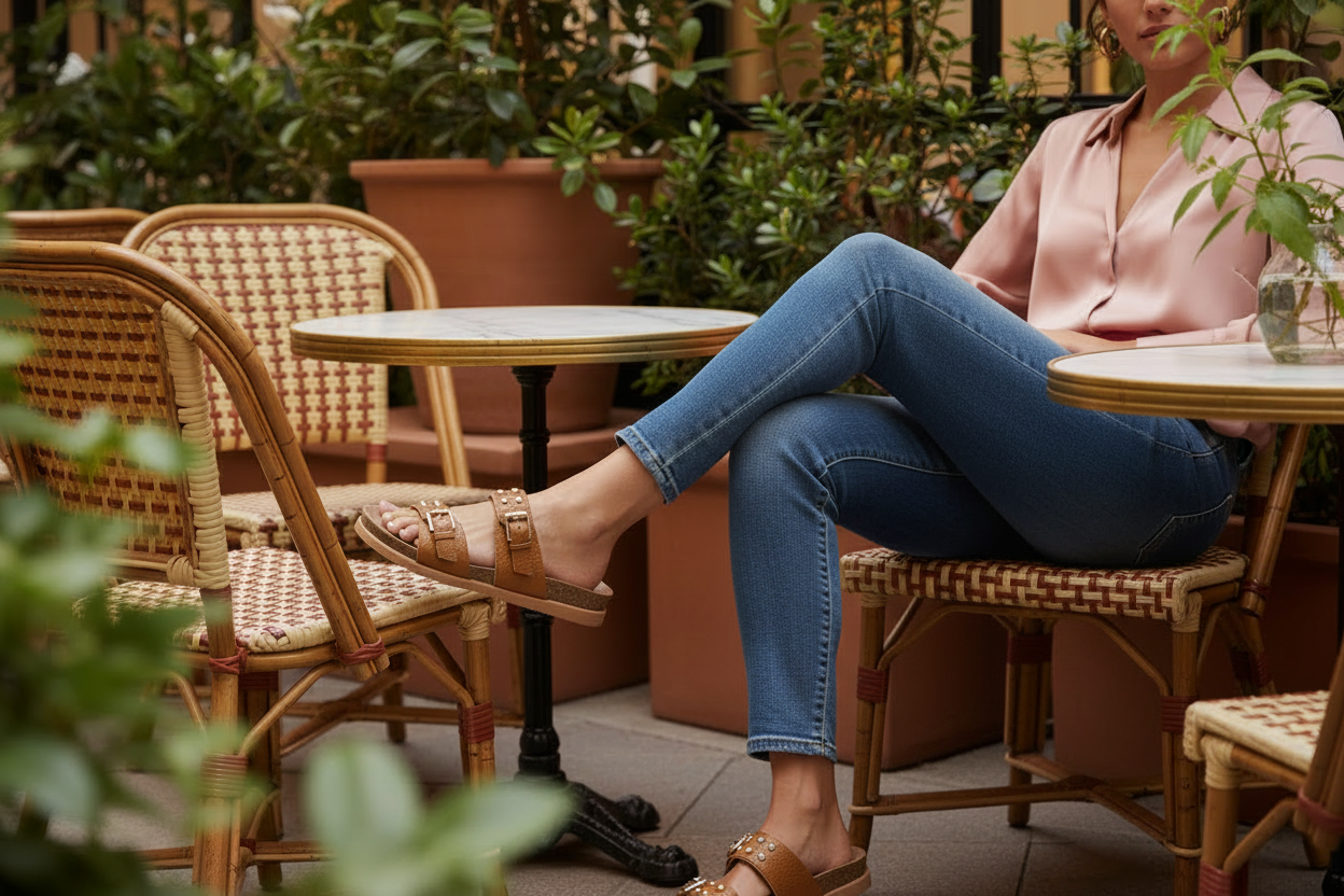 # USAFLEX ZIREL FLATFORMS Experience premium comfort with this leather platform sandal, crafted from supple Catalano leather in a warm tan finish. The buckle closure and decorative accent detail deliver refined style, while Permanent Memory technology ensures the footbed contours to your foot's unique shape, maintaining support and comfort with every wear. The responsive cushioning material provides lasting resilience, making this an ideal choice for all-day wear without compromising on elegance.