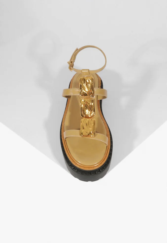Delicate and effortlessly chic, this beige slide sandal features thin straps that create a light, elegant silhouette. A vertical strap adorned with golden accents delivers a glamorous touch, while the brown-toned sole provides subtle contrast. The ankle buckle closure ensures a secure, customized fit. Crafted from premium Brazilian leather, this style combines refined design with exceptional quality.
