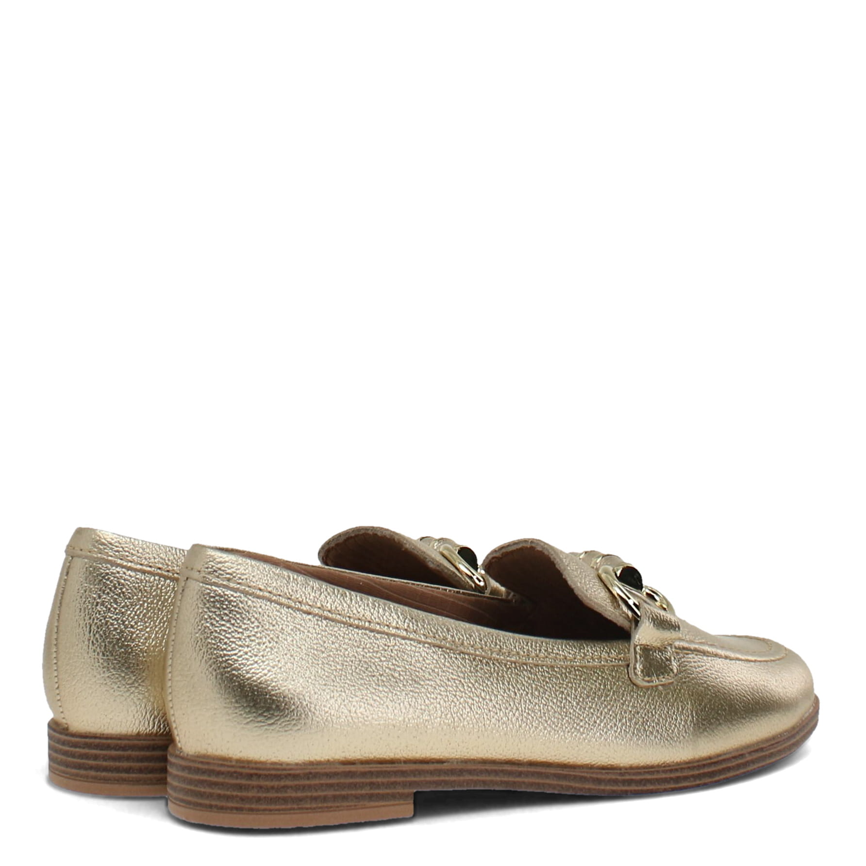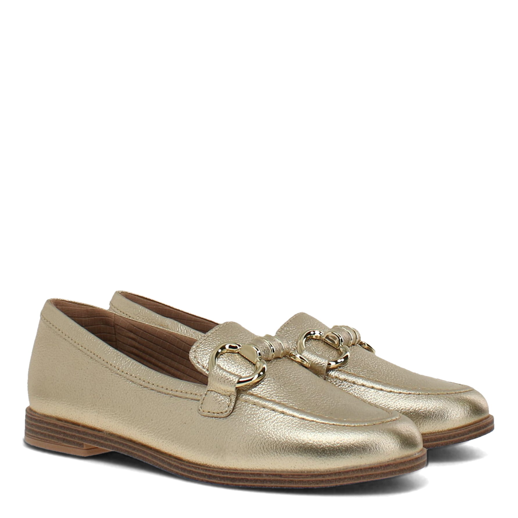 Gold loafers with a brown sole on a white background
