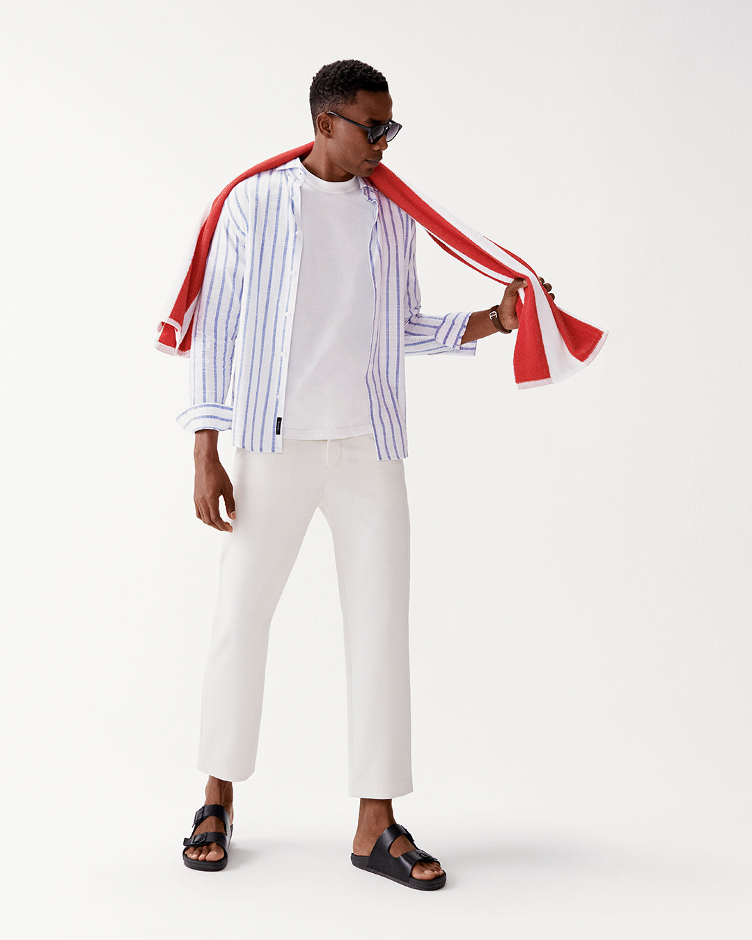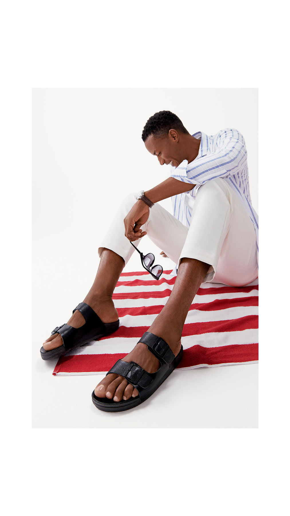 Person wearing black sandals on a red and white striped surface