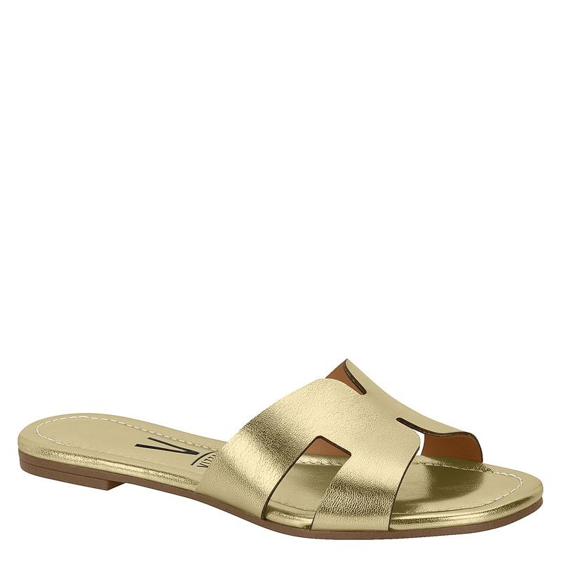 Effortless sophistication meets all-day comfort. This Brazilian-crafted flat sandal features a cushioned footbed wrapped in supple leather with a refined metallic finish. The synthetic leather upper delivers a sleek, contemporary silhouette that transitions seamlessly from day to evening.